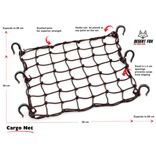 View full detailsDesert Fox Motorcycle Cargo / Luggage Net Secure items on your bikes soft luggage, tail rack, side panniers or top boxes. Unique features sets it a...
