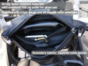 Constructed with heavy duty material (and a purposely designed glove friendly YKK zip) it easily installs on the handlebar or elsewhere on your bike.