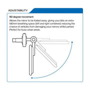 Oxford fold-away bar end mirrors are perfect for busy urban areas. These mirrors can be folded away to give your bike an extra 140mm breathing space (left and right combined). The low-profile design and innovative sprung bearing hinge mechanism allow the mirrors to be folded in when not needed to take up less space.
